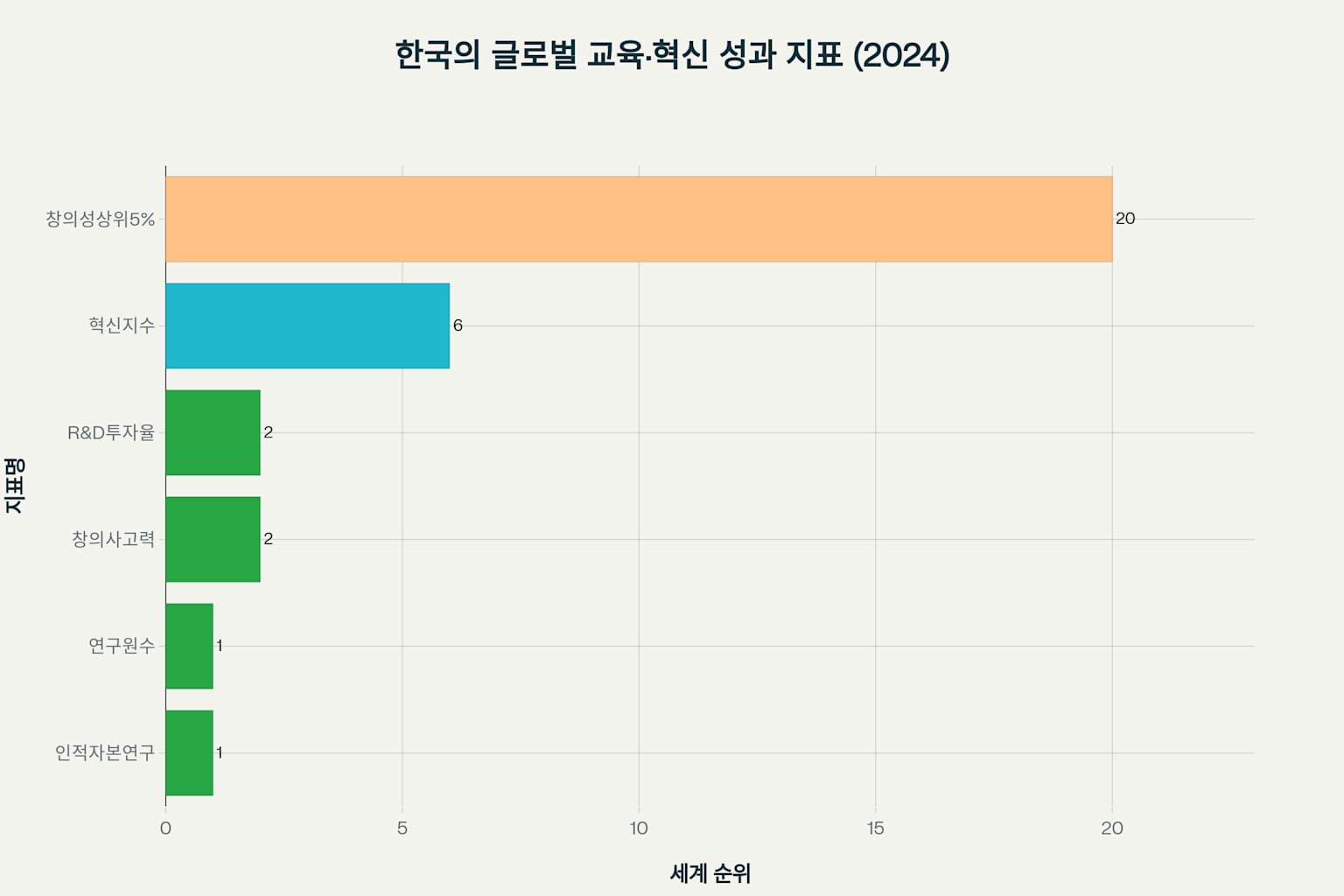 2024년 현재 한국의 교육과 혁신 성과는 세계 최상위권에 위치하고 있다12132628. OECD가 발표한 PISA 2022 창의적 사고력 평가에서 한국은 60점 만점에 38점을 기록해 싱가포르에 이어 세계 2위를 차지했다1213. 세계지식재산기구(WIPO)의 2024 글로벌 혁신지수에서도 133개국 중 6위를 기록하며 5년 연속 10위권을 유지했다2628. 특히 인적자본·연구 부문에서는 6년 연속 세계 1위를 차지했으며, GDP 대비 R&D 투자비율 4.96%로 이스라엘에 이어 세계 2위를 기록했다1921.